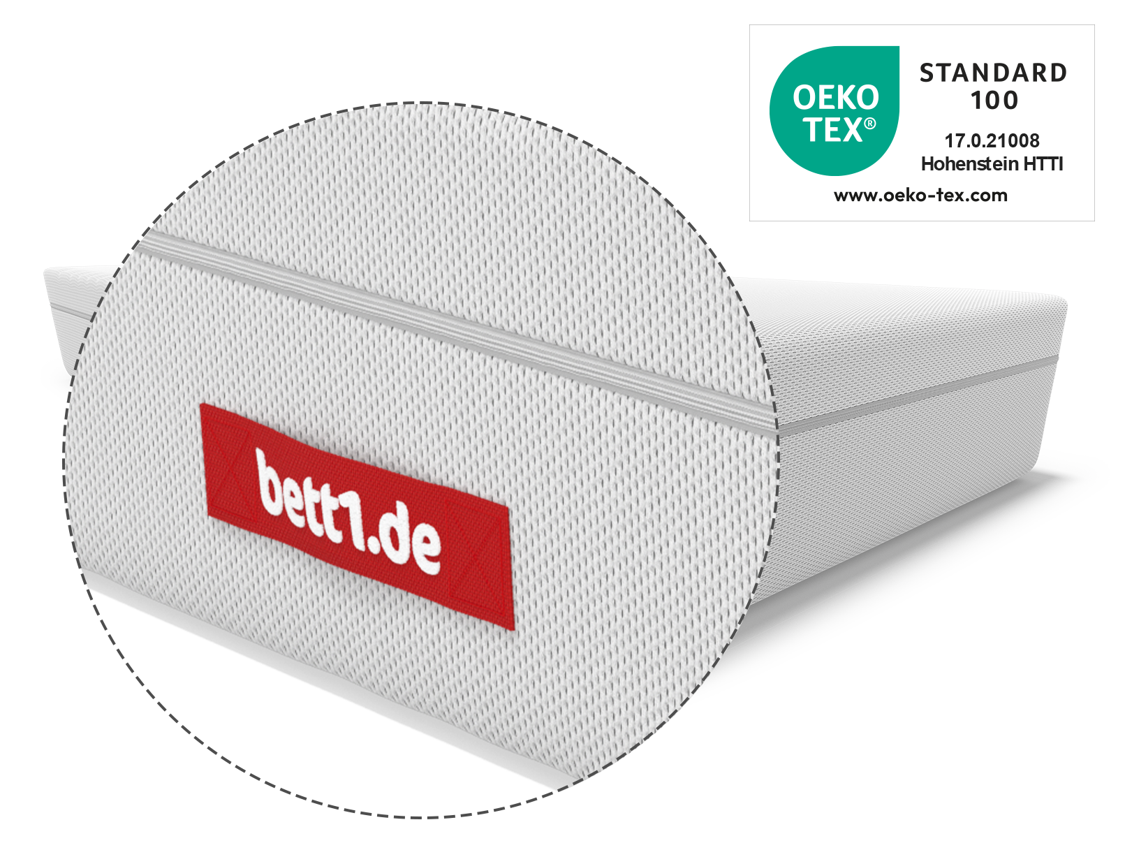 Eine Wäsche bei 60 °C sorgt für ein Maximum an Hygiene und Sauberkeit. Den HyBreeze® Funktionsbezug kannst du dank praktischem Reißverschluss abnehmen und bei 60 °C in der Waschmaschine waschen. Die FLIP® Boxspring Matratze wurde nach OEKO-TEX®-Standard in der strengsten Produktklasse 1 geprüft (Prüf. Nr. 17.0.21008 Hohenstein). Das Label garantiert gesundheitliche Unbedenklichkeit gemäß gesetzlicher Grenzwerte.