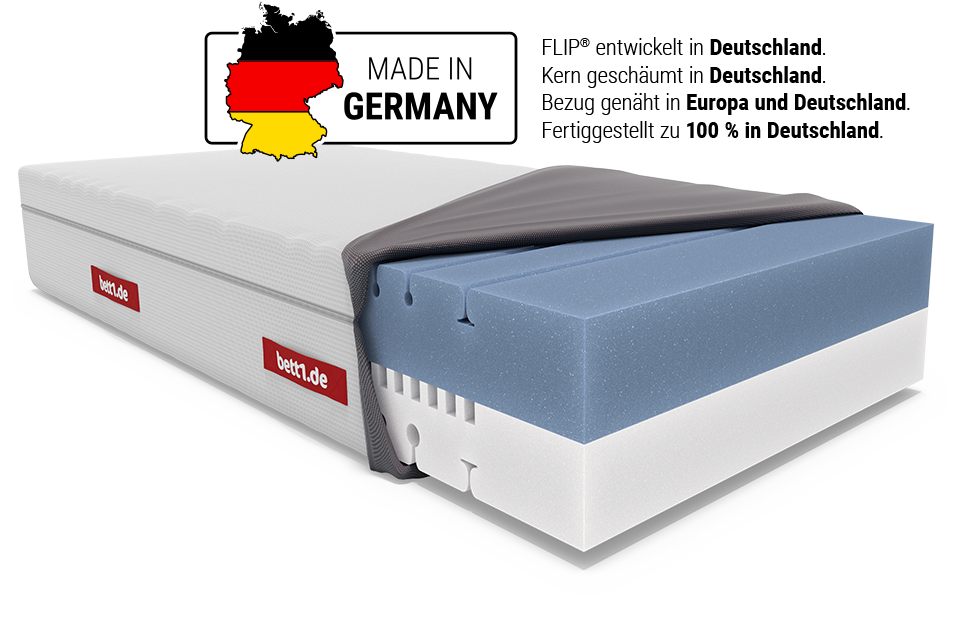 Die FLIP® Matratze verfügt über einen ca. 27,5 cm hohen, hochelastischen Kern aus speziell entwickeltem QXSchaum®. Dieser ist so hochwertig, dass wir dir 10 Jahre Garantie auf den Matratzenkern geben! Jede Matratze ist zu 100 % entwickelt und geschäumt in Deutschland. Jeder Bezug in Deutschland & Europa genäht. Die Matratze wird zu 100 % in Deutschland fertiggestellt.